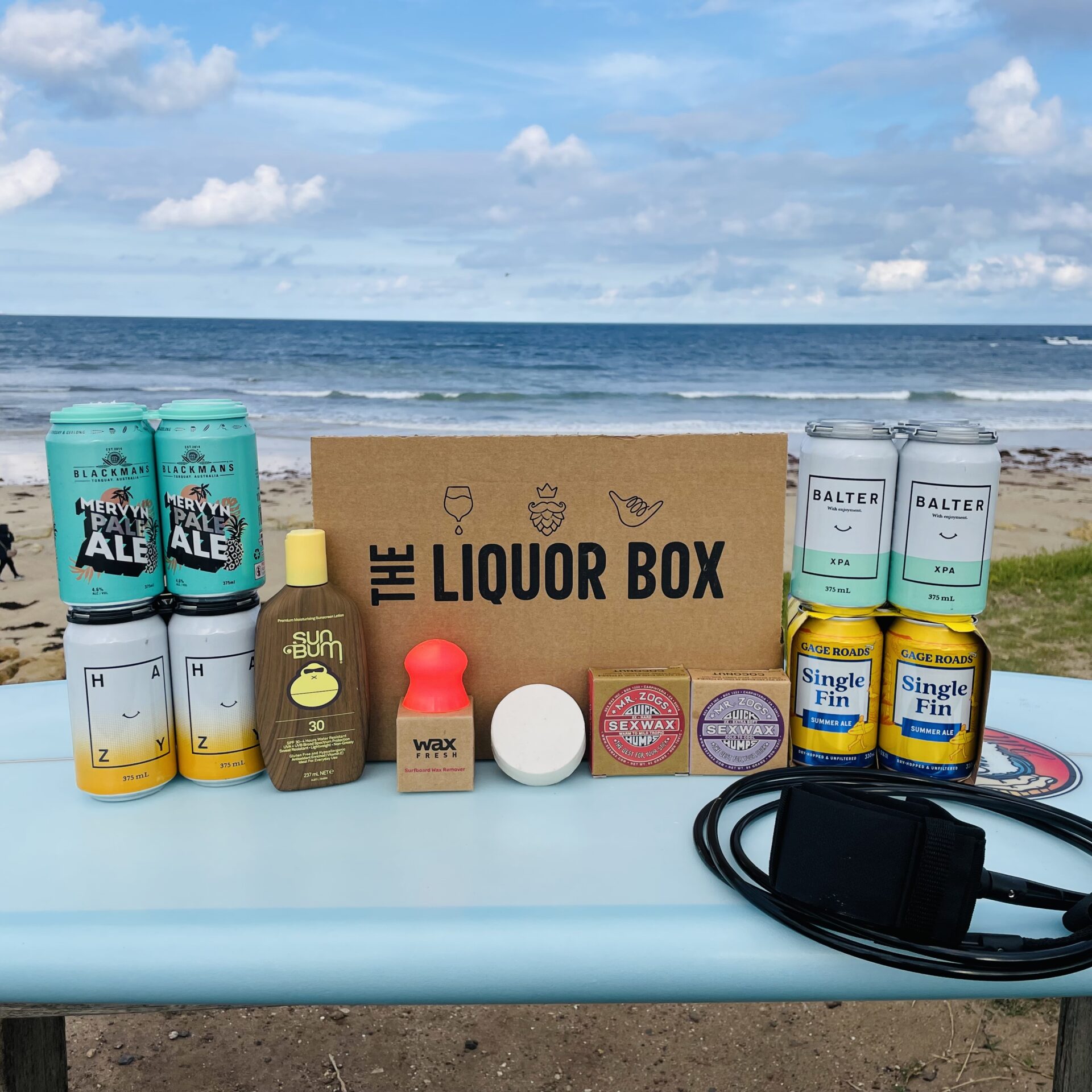 4 pack of Blackman’s Mervyn Pale Ales 4 pack of Balter XPAs 4 pack of Balter Hazy IPAs 6 pack of Single Fin Summer Ales Sun Bum Wax Fresh (Wax Remover) Waxes x 2 (Climate Customized) Leg rope