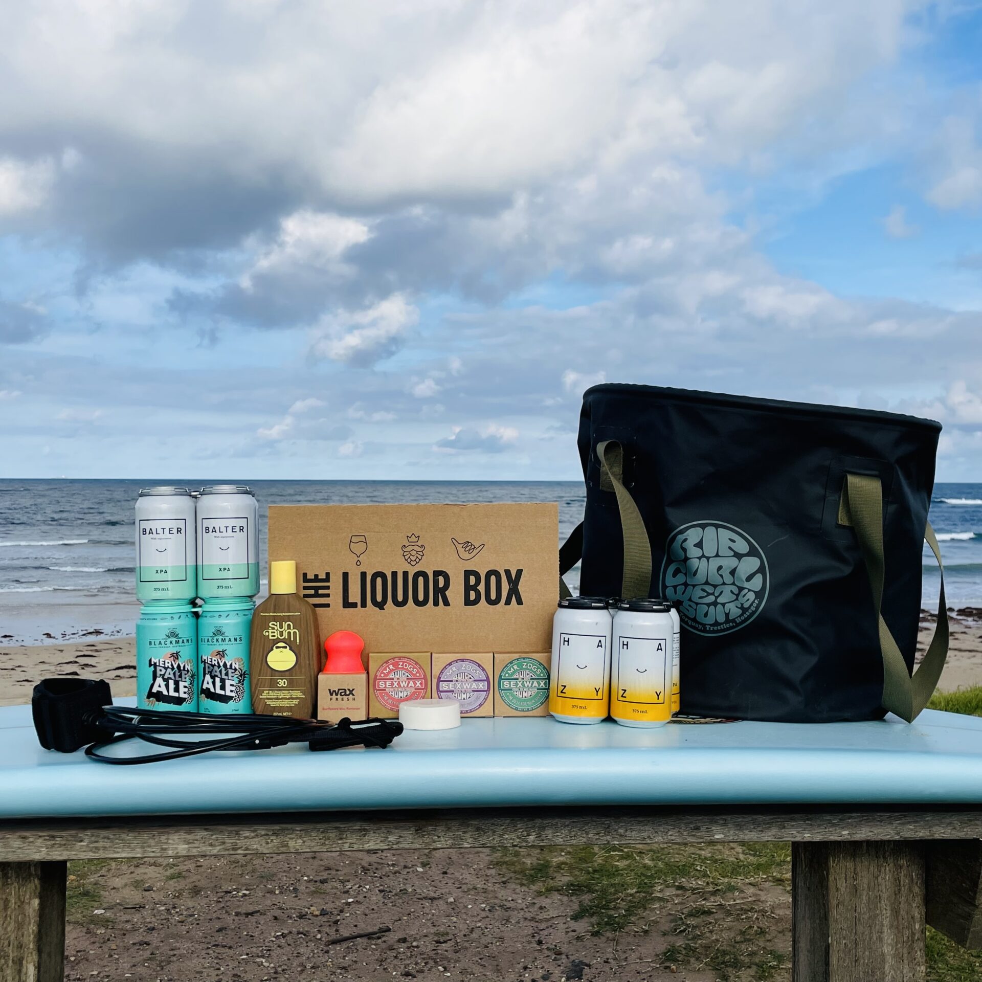 4 pack of Blackman’s Mervyn Pale Ales 4 pack of Balter XPAs 4 pack of Balter Hazy IPAs Sun Bum Wax Fresh (Wax Remover) Waxes x 3 (Climate Customized) Leg Rope Surf Bucket